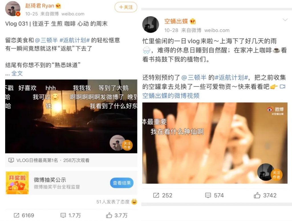 在内容投放上,三顿半将返航计划作为一个话题亮点,对博主进行投放,通过照片、Vlog的形式传递返航计划的有趣和粉丝线下面基,换礼物的惊喜感。通过粉丝和博主带话题词的花样晒单,引发人们对这一计划的兴趣,同时因为“返航”这一词汇自带温情,不仅激发了人们的二次创作欲,也强化了消费者对其环保理念的认同。