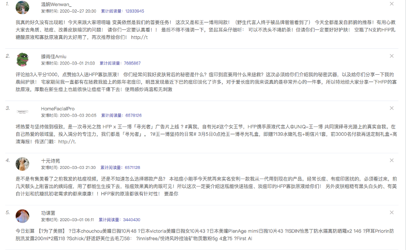 举个例子,主打成分党的国货美妆品牌HFP(HomeFacialPro)在成立初期就是主要利用微信公众号KOL来教育市场和获取种子用户的。微信是HFP的核心投放平台,它在成立初期的9个月内密集投放了大约700条微信KOL广告。