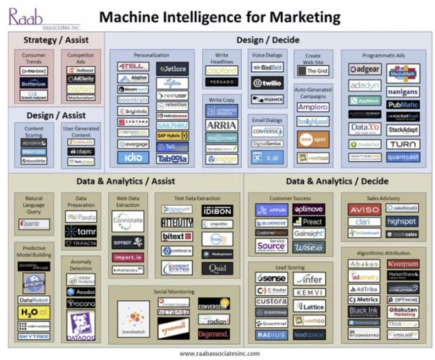 实际上,你可以从 MarTech 分析大牛 David Raab 在上次旧金山 MarTech 大会上分享的这张表格中看到,AI(机器智能) 让行业中各种规模的服务商得以蓬勃发展(这张图只是列表中的一部分而已)。