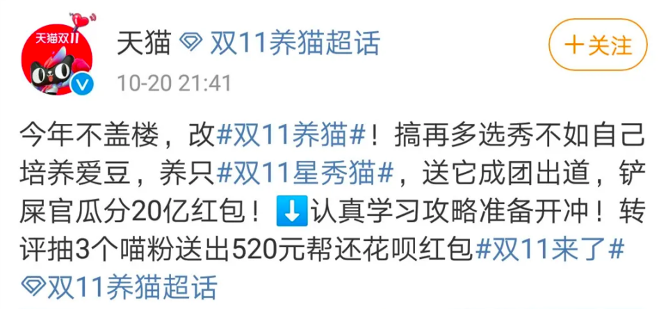 但不同的是,今年的“猫”是养成系的,将猫咪养成出道,才有机会瓜分红包。用网友的一句话调侃,“2020年双11,我们都需要组建一支专业的云养猫团队。”