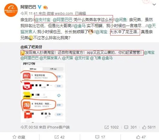 再比如淘宝特价版的出道,淘宝特价版APP logo被网友质疑“太丑,真的是正版吗”,继而天猫、淘宝、盒马等一众APP在微博上的回复也尽显人情味;继而其吉祥物-特小丑又再次被同系伙伴尽情吐槽,这样的方式不仅降低了宣传成本,还快速建立起用户对品牌的认知,建立起品牌认知度。