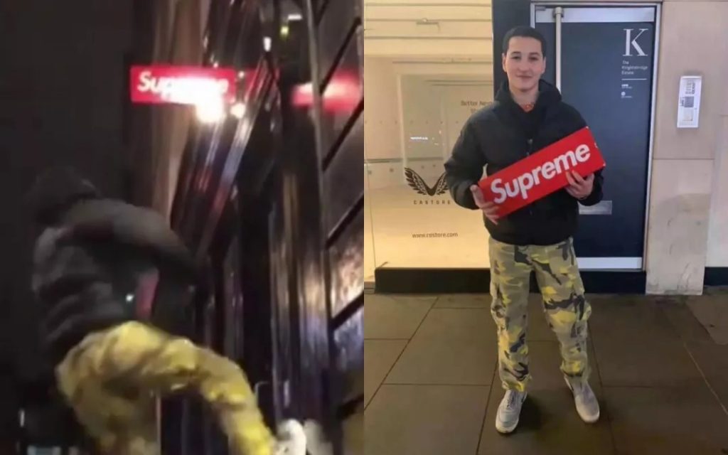 只要是Supreme都香,从线下店走出来,连购物袋都有人愿意收购,狂热上头,Supreme伦敦店的红色招牌都被人撬了,被店长悬赏一件Supreme Box Logo Crewneck全城通缉。