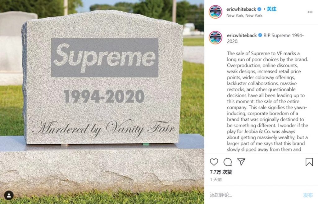 一夜之间被资本收编,大批Supreme铁粉崩溃了,骨灰级收藏家@ericwhiteback直接在Instagram宣读了Supreme的讣告。