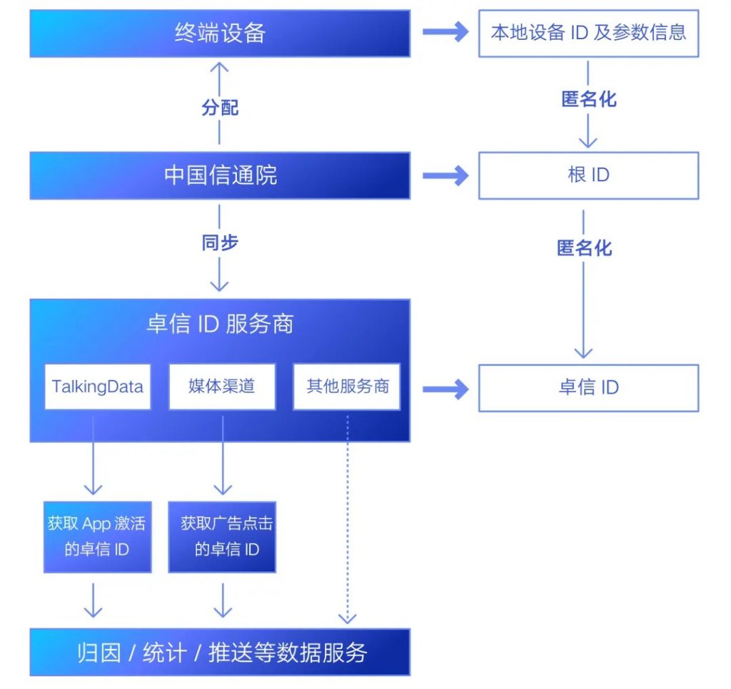 卓信 ID 是中国信息通信研究院(China Academy of Information and Communications Technology,简称CAICT)参考了 DNS 设计理念并经过 TalkingData、抖音、秒针、个推等头部服务商测试运行后,最终推出为解决移动互联网反欺诈和广告效果监测难题的 ID 体系。在此简单介绍一下卓信 ID 生成原理: