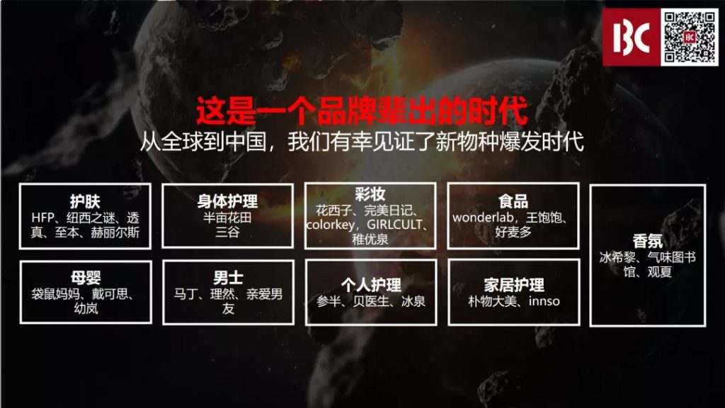 在过去五年,整个中国消费品领域带来品牌爆发浪潮。比如说在我们护肤品类当中,我们看到HFP、纽西之谜、透真、至本、赫丽尔斯;母婴品类当中,有袋鼠妈妈、戴可思、幼岚这样的优质品牌;身体护理中有半亩花田、三谷;男士中有马丁、理然、亲爱男友,其他像彩妆、个人护理、食品、家居护理、香氛等,各个品类都有很多的案例和品牌。短短五年时间内,不断有品牌得以涌现。