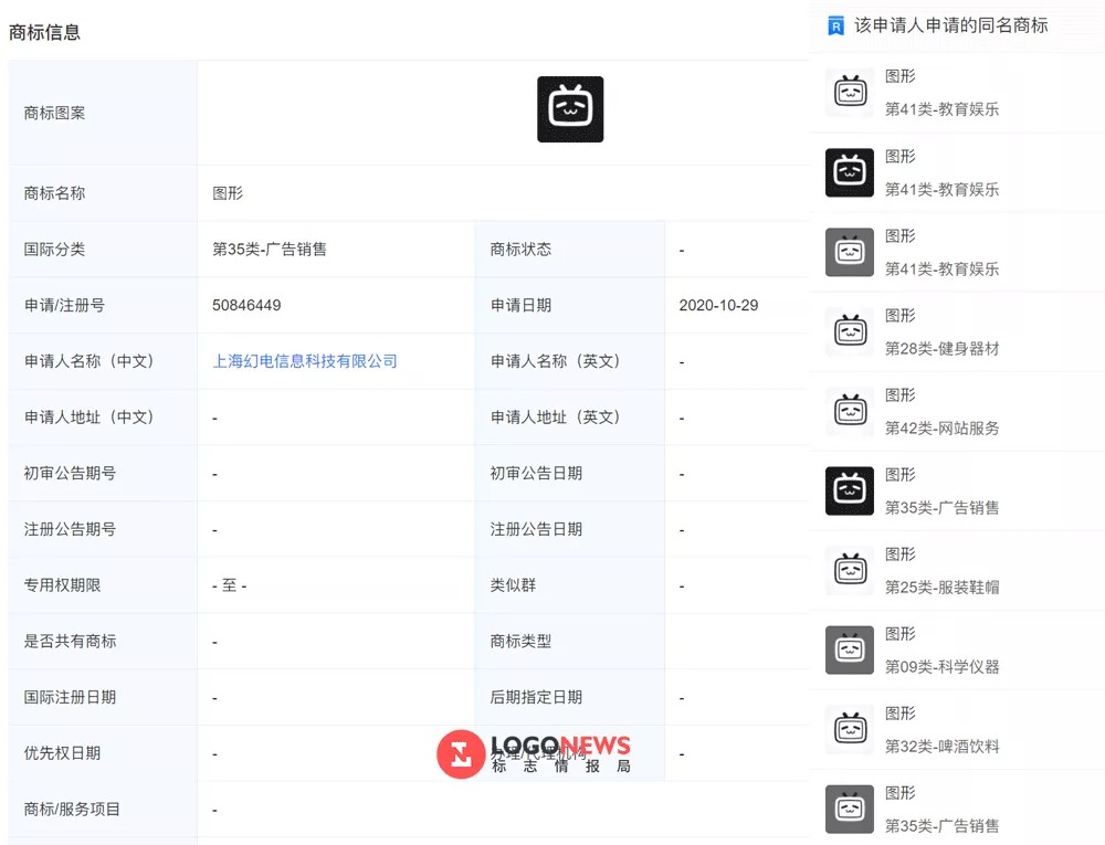 通过查询发现,b站修改了卡通小电视图标并调整了字标的部分细节,然后迅速用新版图标申请注册了多个领域的图形商标。