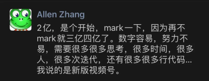 所以我看好视频号,但是这个产品需要再打磨细节,融会贯通。怎么把微信的各种产品融合起来打造成一个好的社区,还有很多细致的工作要去做,还是蛮漫长的一条路。