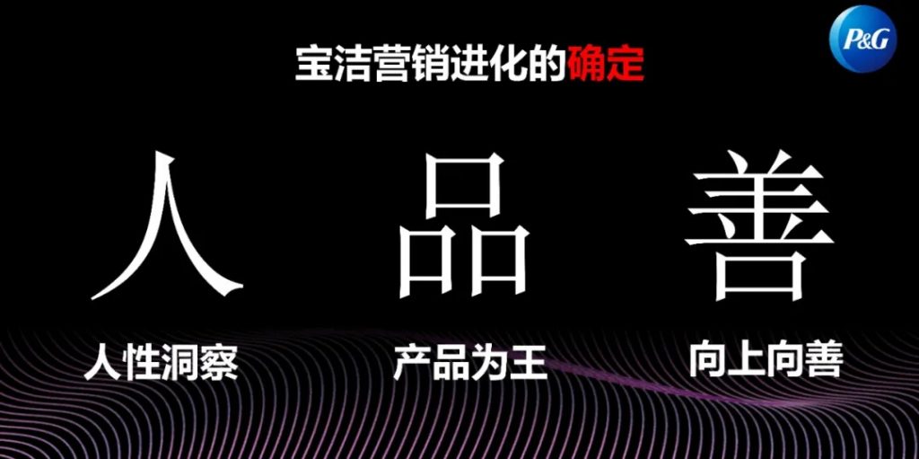 把它很简单的总结成3个字:“人、品、善”,做人要人品好,做营销也需要“人、品、善”。宝洁在拥抱新时代的不确定性,在不断寻找不确定性里面确定的规律,消灭不确定,寻找对于营销底层的逻辑。