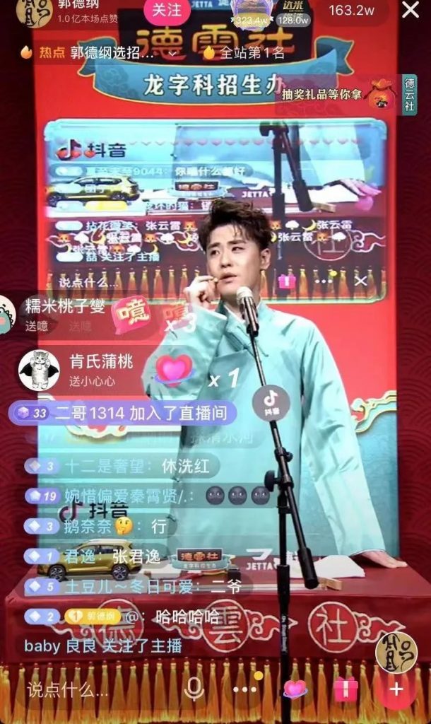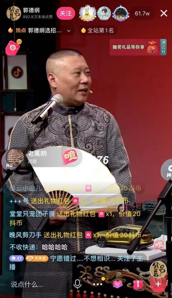 今晚7点,相声界的弄潮儿——正式开启了德云社龙字科招生抖音直播首秀,于谦、高峰、云鹤九霄众弟子也纷纷前来助阵。直播中,郭德纲和于谦带观众回顾了德云社的发展,虽未真正入活说相声,但两人一逗一捧,也是相得益彰,妙趣横生。在开播12分钟后,直播间的在线人数迅速蹿升到了100万,评论区的观众更是难掩激动“在抖音就能看到德云相声,2020终于优待了我一回”。