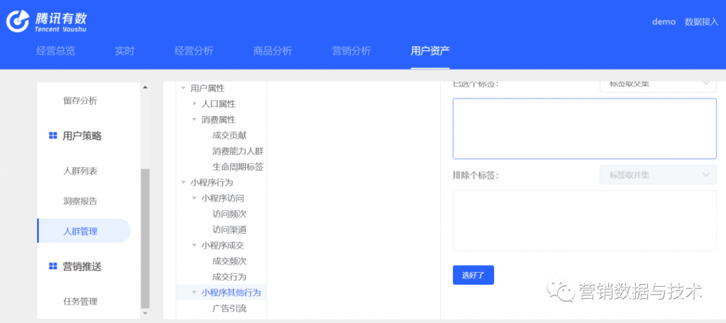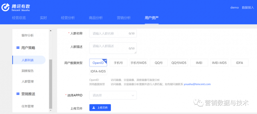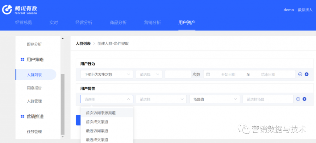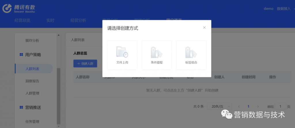 【有数】支持三种私域人群选择方式:上传文件、条件提取和标签组合,基本上把所有品牌和商家可以用来描述和选择人群的条件都列出来了。