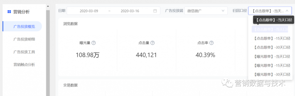 长久以来,营销部门最大的困惑就是怎么能从数据上给老板讲清楚“归因时间窗口”、“多渠道归因模型”等等概念,有数在功能上提供了从当天转化到30天转化的时间窗口可供选择,并且分曝光跟单(归因)和点击跟单(归因),方便看到和对比短期和长期的转化表现以及投资回报。