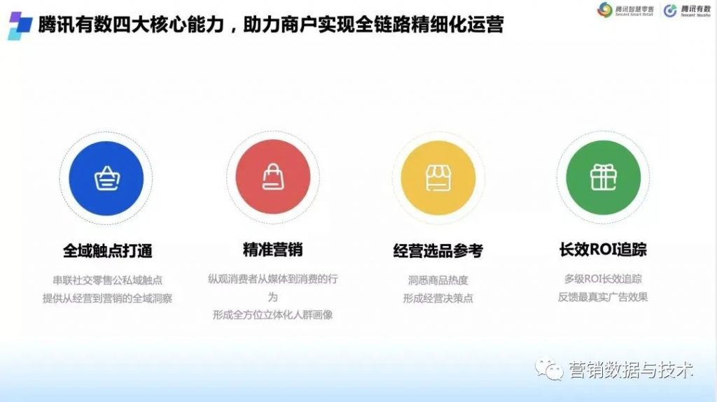 腾讯一定也是看到了这些痛点,于2020年11月25日,正式发布【腾讯有数】2.0版本,以更好地赋能私域运营业态。新上线产品主要包含四大核心能力,即全域数据打通、精准营销、经营选品参考和长效ROI追踪。