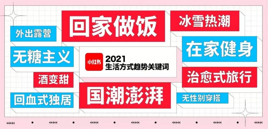 为此,小红书提炼出了2021年的10个生活方式趋势:冰雪热潮、无糖主义、酒变甜、回血式独居、无性别穿搭、国潮澎湃、在家健身、治愈式旅行、外出露营、回家做饭。这一内容组合已与过去形成了巨大反差。