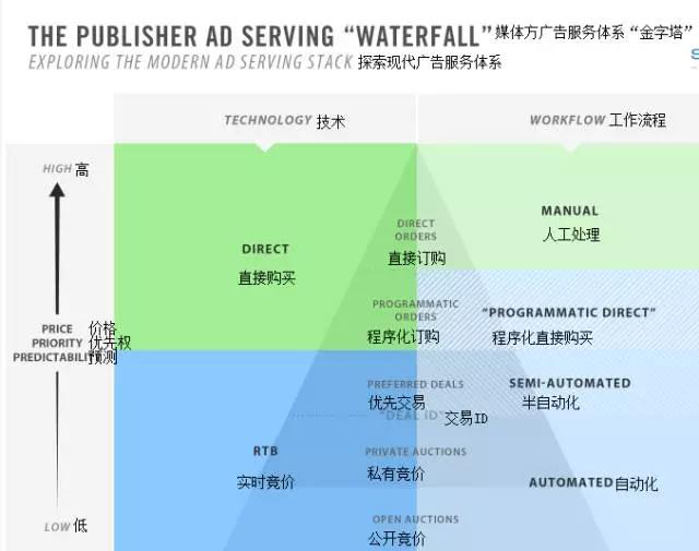 下图展示了当前的现代媒体们为了在直接订购和程序化渠道(即所谓的广告服务体系“金字塔”)业务上变现,是如何为自身内部广告服务(ad serving)体系分配广告资源的优先级的。