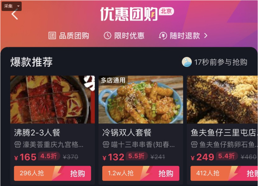 2 月 24 日,抖音App 开始内测 “优惠团购”功能,形式上类似于美团的到店团购。目前主攻有两大板块,美食餐饮和酒店民宿,已在北京、上海、成都、杭州等城市开通。