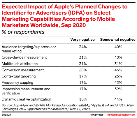 根据AppsFlyer和移动营销协会(MMA)2020年9月的一项调查,全球大多数移动营销人员预计IDFA的变化将对从目标定向和展现验证到频率上限、转化测量和多点触控属性的所有方面产生负面影响。