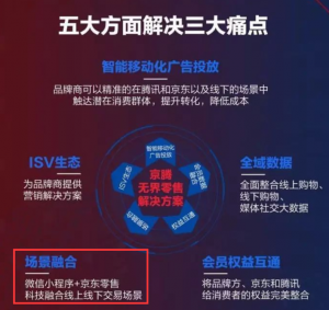 而京东腾讯推出“京腾无界零售”的解决方案,则是为了解决品牌商广告与销售数据无法打通、营销场景无法贯通、交易无法同步的问题。通过打通腾讯的用户数据、京东的用户购物数据,并将其与腾讯与京东上的广告资源进行融合,实现更好效果、更可追踪的电商(尤其是品牌电商)的广告投放,并且更进一步实现品牌商线下购物数据及场景同线上营销和运营的整合。