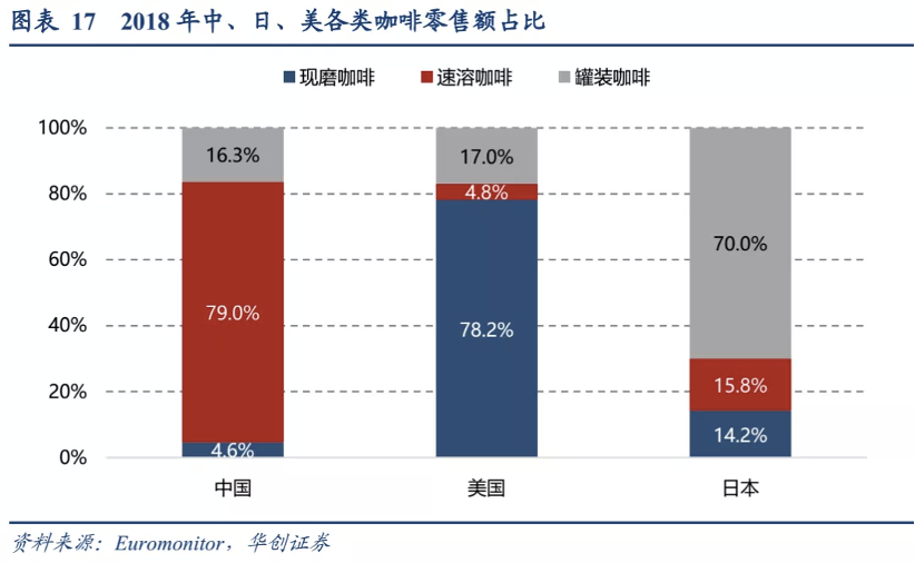 与此同时,本土新玩家也越来越多,尤其是在线下咖啡赛道。虽然目前在中国市场份额最高的仍旧是「速溶咖啡」达到79%,但如果将这一数据与市场成熟度更高的美国作对比,会发现全然相反,美国现磨咖啡市场份额已经达到了78.2%,这意味着现磨咖啡的想象空间巨大。