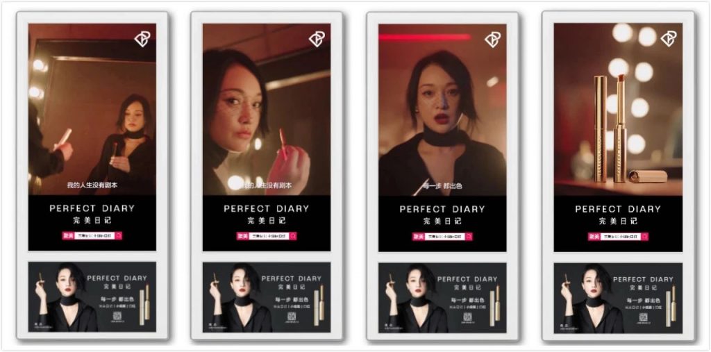 完美日记除了在微博、知乎等线上平台投放了这支短片,还与新潮传媒达成合作,通过电梯触达消费者。