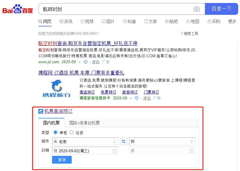 比如,下图中,你在百度的搜索结果页面中,可以直接查询携程网上的航班信息。这就是利用了API,将携程中的数据,直接传送到了你的搜索结果页面上。