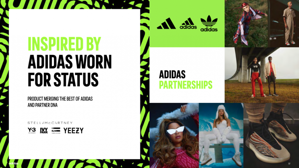 这三条线未来都会有合作(Partnership),比如 YEEZY、Y3 的合作,则是:受 adidas 灵感启发,为引领而穿。