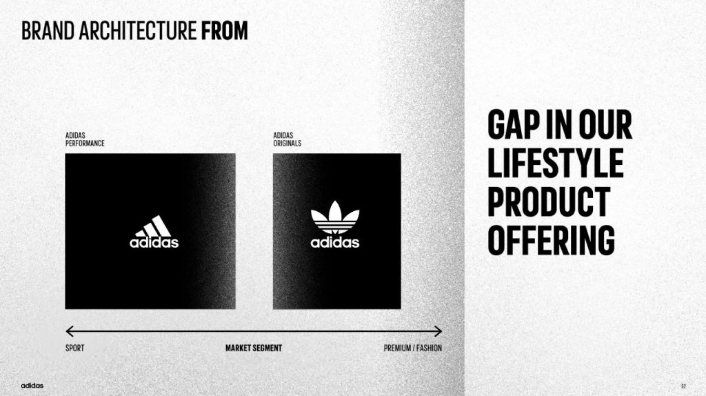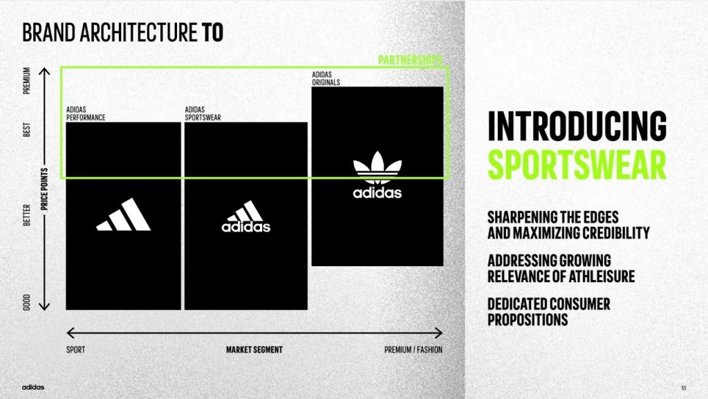 除了向 DTC 转型以外,「掌控全场」五年战略还披露了 adidas 重要的品牌结构(Brand Architecture)转型。