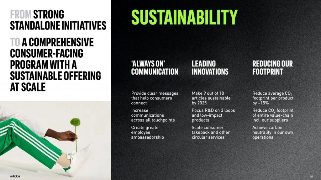 到 2025 年 adidas 的目标为,10 件产品中将会有 9 件都是可持续的。