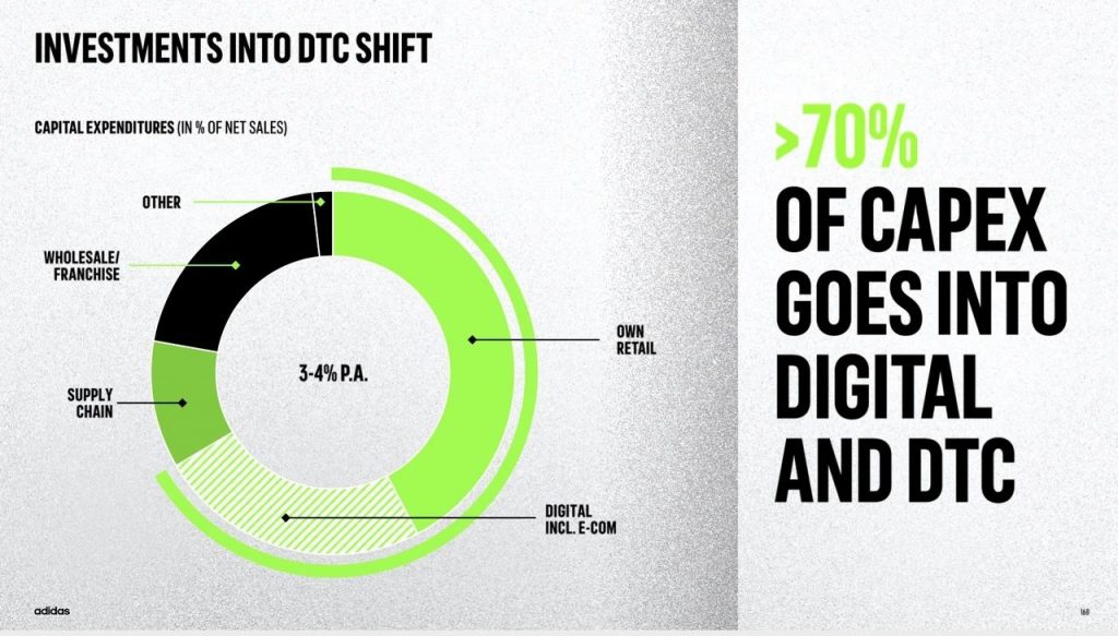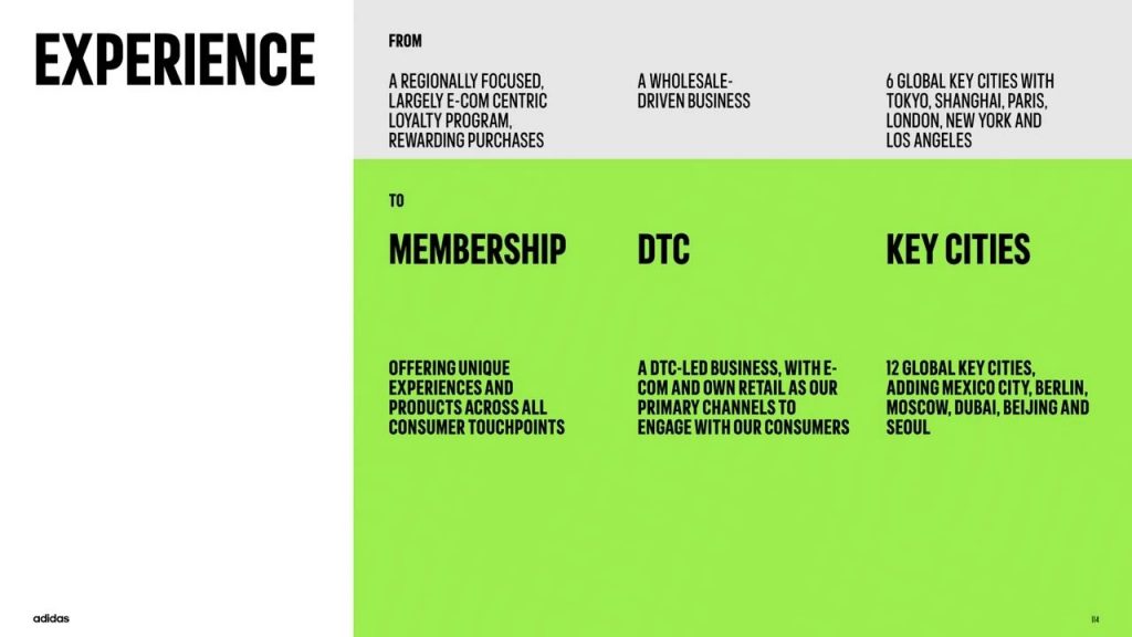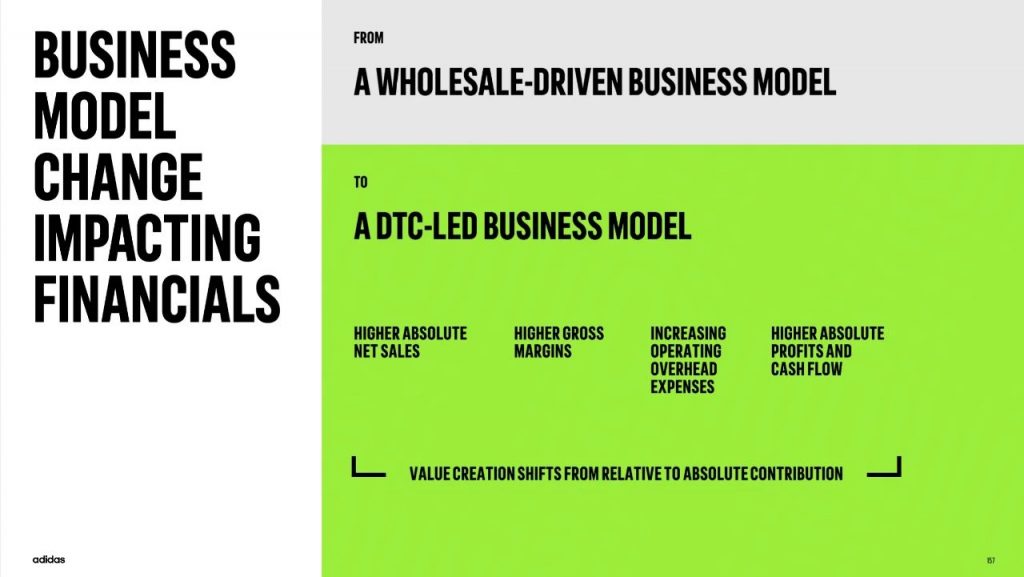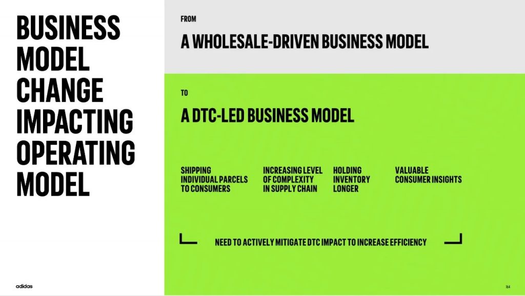 adidas 在会议文件中写到:「此前,adidas 以批发零售(Wholesale)为主导。但现在,adidas 将以 DTC 模式为主导、以电商和自有零售渠道为主,去和我们的消费者连接。」