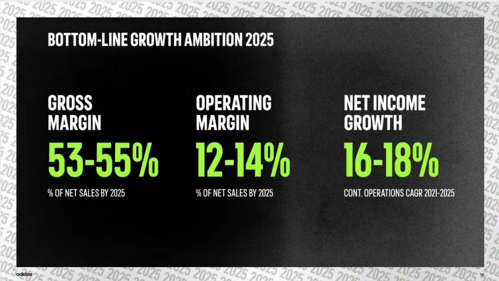 在 2025 年,adidas 的目标毛利率要达到 53%-55%,营运利润率达到 12-14%,净营收增长达到 16-18%。
