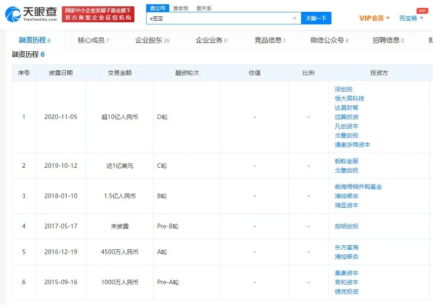 e签宝方面,根据天眼查APP融资历程信息显示:D轮融的投资方为深创投、恒大高科技、达晨财智、远翼投资、凡创资本、戈壁创投、通衡浙商资本等知名投资机构。C轮融资的投资方为蚂蚁金服、戈壁创投。