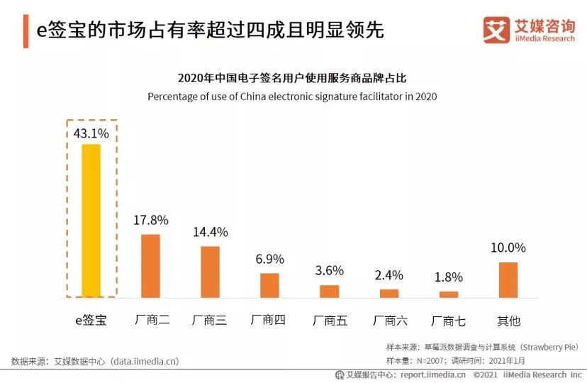 在国内,根据艾媒咨询的电子签名行业情况显示,2020年中国电子签名市场占有率,e签宝达到了43.1%,位居行业第一。