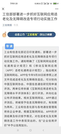 近日,工信部印发通知,明确了《互联网网站适老化通用设计规范》和《移动互联网应用(APP)适老化通用设计规范》(以下简称规范),助力老年人、残疾人等重点受益群体平等便捷地获取、使用互联网应用信息。