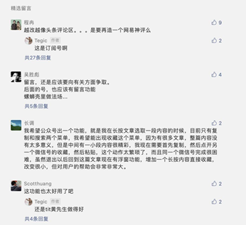 4月14日 微信公众号测试文章评论区“盖楼”,支持用户之间互动