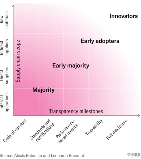 于是麻省理工学院运输与物流中心学者 Alexis Bateman 和倡议供应链透明平台 Sourcemap 合作,基于传播学者 Everett Rogers 1962 年提出的「创新扩散理论」——接受新观念、新事物、新产品的人们可以分为「创新者」「早期采用者」「早期跟随者」「后期跟随者」「滞后者」,拟定了「供应链透明化」的四个进程。