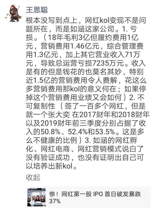 素有“国民老公”之称的王思聪曾在微博发表点评说,如涵上市破发并不是因为如涵签下的KOL变现问题,而是如涵这家公司本身就有问题。