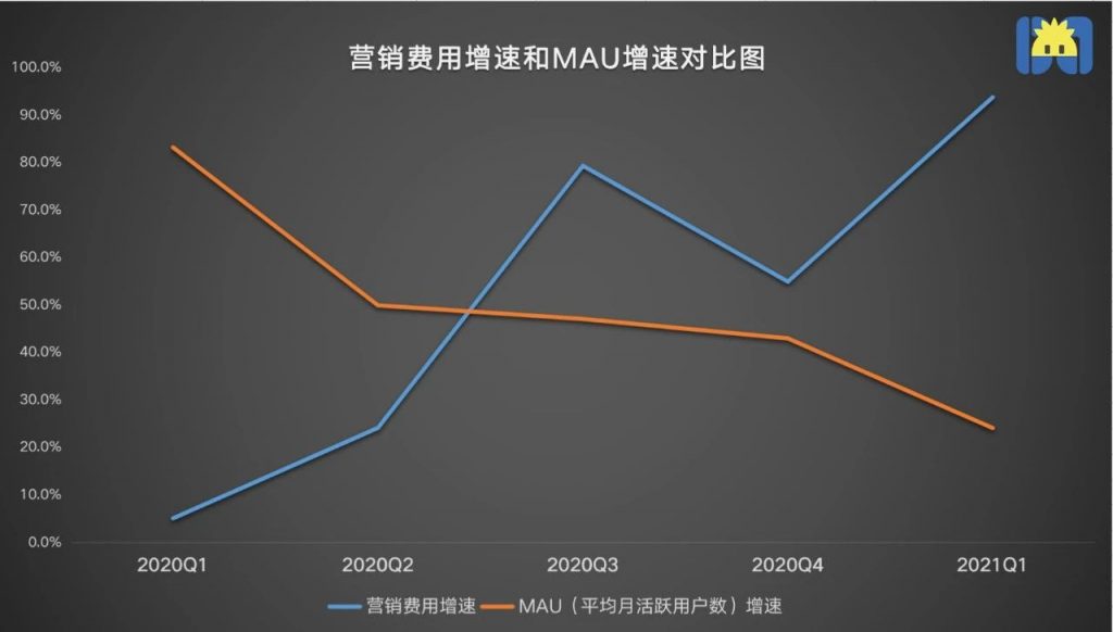 另一个明显的变化是,2020年初,受益于疫情期间“宅经济”的刺激,喜马拉雅的MAU增速高达83%,可一旦疫情得到控制、利好因子消失,活跃用户增速一路向下。2021Q1,喜马拉雅在上市前一系列烧钱活动,依然没有换来更多的用户关注度。