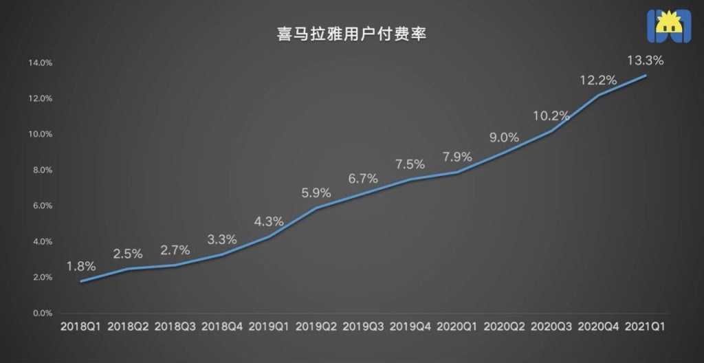 招股书显示,会员及付费订阅一直是喜马拉雅的基本盘,对收入的贡献度始终保持在43%左右,2020年贡献了17亿的收入。但用户付费率才是评判知识付费模式的核心指标。截至2021年第一季度,喜马拉雅平均月活跃用户为2.5亿,平均月活跃移动端付费用户为1390万,付费率为13.3%。