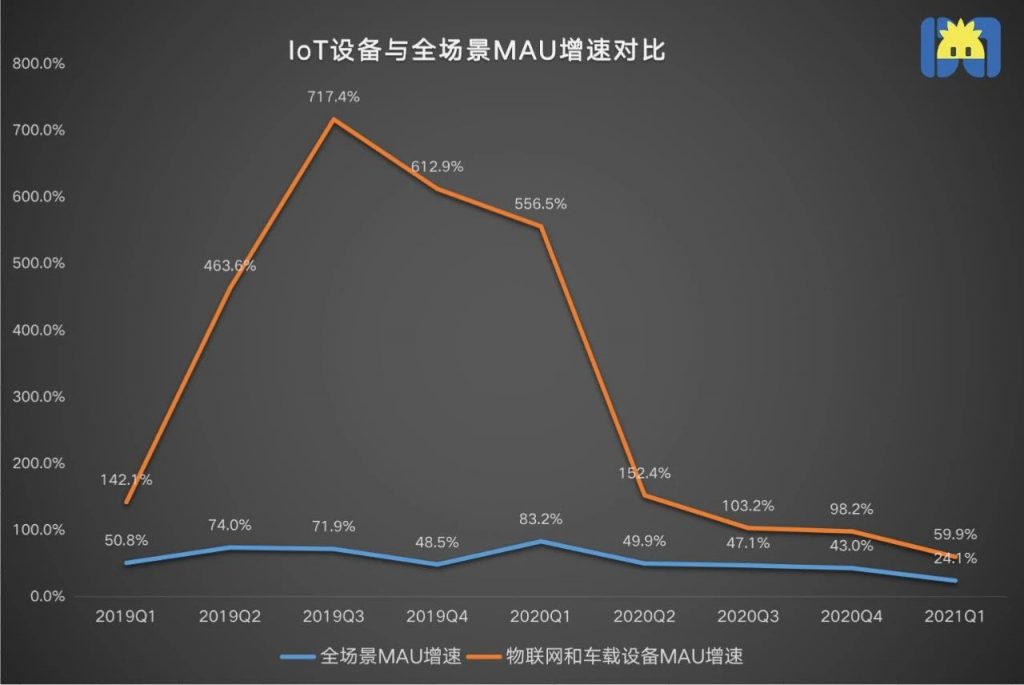 但我们来仔细拆解下这组数据,就会发现形势并不乐观。上述1.46亿里,9770万月活来自第三方应用,剩下的4830万才是物联网和车载设备月活用户,也就是说,截至2021Q1,MAU的“含loT率”为19%。而且近两年,IoT设备的MAU增速呈减缓趋势