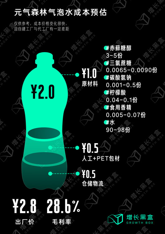 • 元气森林作为新品牌就敢定高价,也敢投入成本买贵的原料:元气森林气泡水每瓶原料成本是1元,远高于传统巨头,就是因为采用的代糖“赤藓糖醇”价格比较高。
