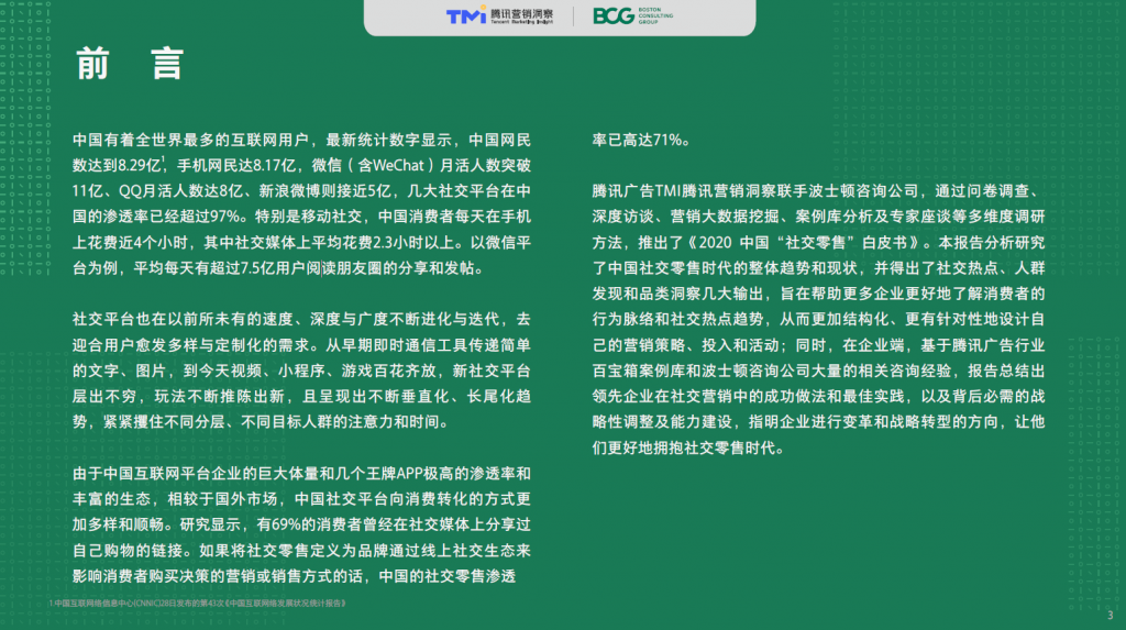 本次解读的是2020 TMI腾讯营销洞察与BCG联合发布的中国“社交零售”联合报告,其中介绍了中国社交零售的背景、消费者社交零售⾏为洞察、七⼤⾏业社交零售战略的分析以及社交零售趋势对品牌公司的意义。