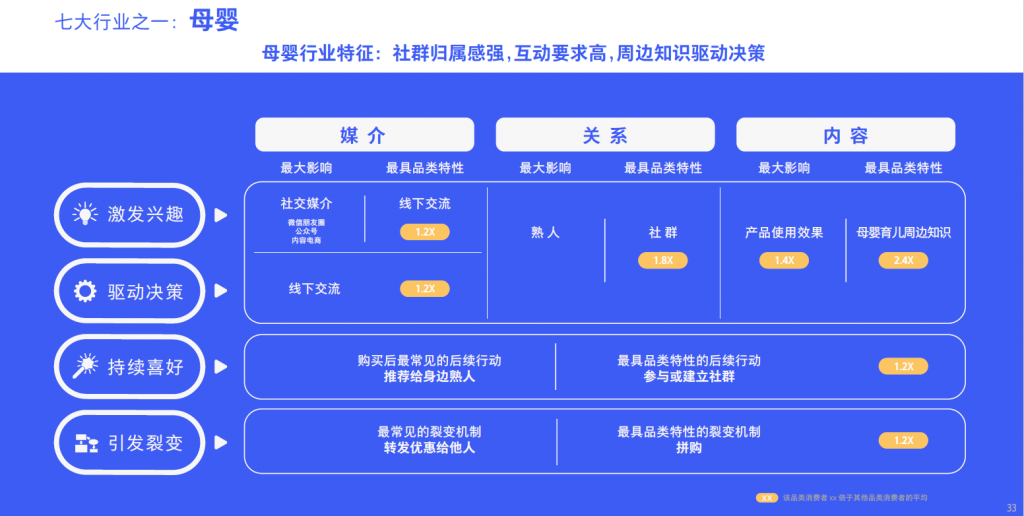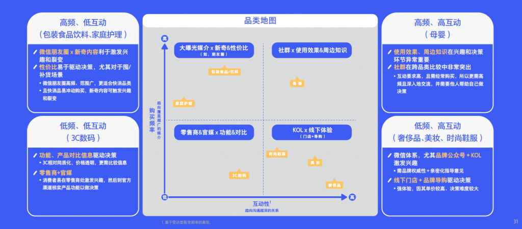 对于⾼频低互动的⾏业,如包装⻝品饮料及家庭护理⾏业,需要通过⼤曝光媒介传播新奇的内容来激发兴趣和诱发裂变,并通过提供超⾼性价⽐来驱动购买决策。对于低频低互动象限的3C数码⾏业,则需要通过零售商加官媒的组合来激发兴趣并通过提供功能和产品的对⽐信息来驱动决策。⾼频⾼互动的⺟婴⾏业,品牌若能很好地经营社群并提供使⽤效果及周边知识则容易驱动消费者的购买决策。相对其他象限的⾏业,奢侈品、美妆和时尚鞋服⾏业则具有低频但⾼互动特性,针对这⼀特性,可通过品牌官⽅渠道,如品牌公众号、线下⻔店等,加上KOL来驱动消费者的购买决定。
