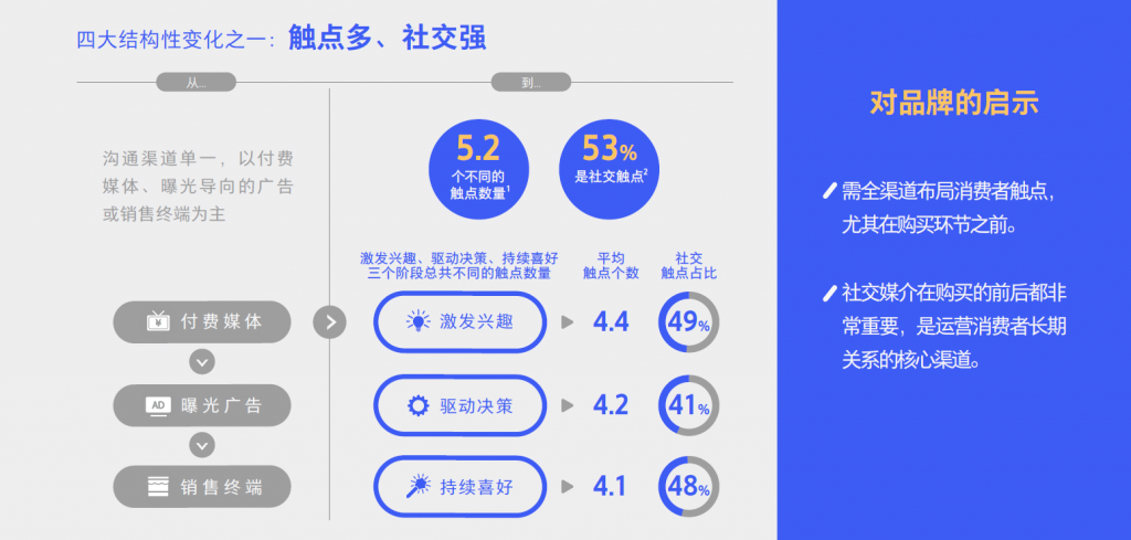品牌与消费者沟通渠道的变化,从以付费媒体、曝光导向的⼴告,或销售终端为主的沟通渠道,变化为⼈均5.2个触点的沟通渠道。其中,⼀半以上(53%)社交触点。