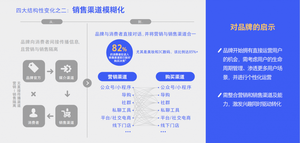从品牌营销与销售渠道的隔离到销售渠道模糊化。据统计,约82%的消费者在进⼊销售渠道前已经做好了购买决策。