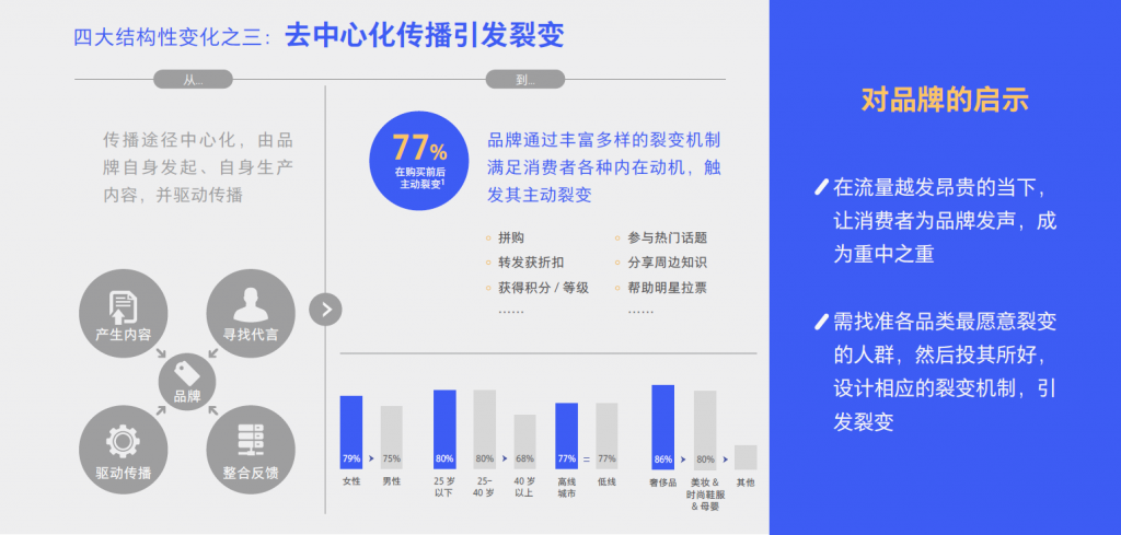 传播途径由中⼼化到去中⼼化。从传统的由品牌⾃身发起的、驱动的传播到现在引发消费者主动裂变。据统计,77%的消费者在购买前后主动裂变。