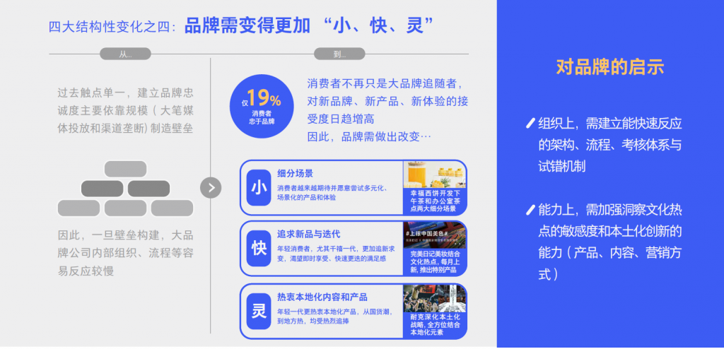 建⽴消费者忠诚度的⽅式,从之前的依靠规模制造壁垒到社交时代下的⼩品牌借助社交媒体,经营属于他们的⾼忠诚度客户群。小品牌快速迭代,不断创新。相比之下,后工业时代遗留下来了的品牌巨头,如同远古恐龙一般笨拙,不适应新变化。