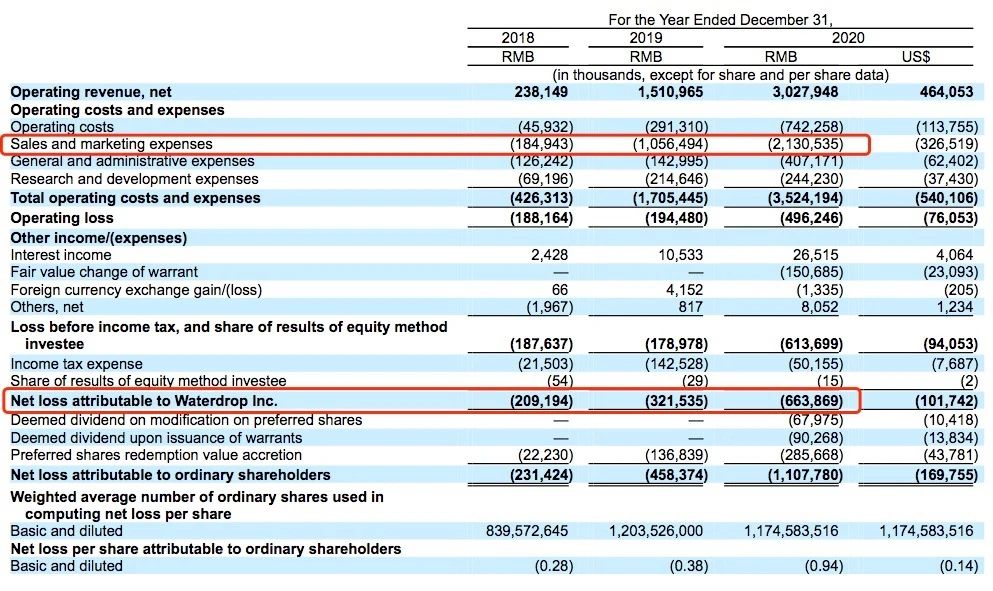正因为营销成本居高不下,并随着保险业务规模扩大水涨船高,水滴的亏损也越来越多。过去三年净亏损分别为2.09亿元、3.21亿元和6.63亿元。