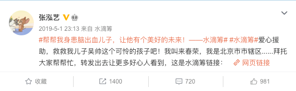 2019年5月1日,吴帅妻子张泓艺在微博上转发一条水滴筹链接。内容以吴帅父母口吻介绍吴帅突发脑出血,但父母已经退休,收入不够支持医疗开销,筹款100万元,并且附上了无房产、有一辆价值13万的汽车、家庭年收入为7万的贫困户证明。