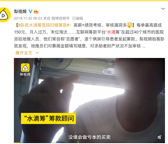 2019年8月,梨视频一条暗访视频登上热搜。视频中自称“志愿者”的水滴地推人员,每天的工作是在全国40多个城市的医院扫楼,介绍病人在水滴上发起众筹,每拉一单有80-150元绩效,有老员工一个月收入14000元。