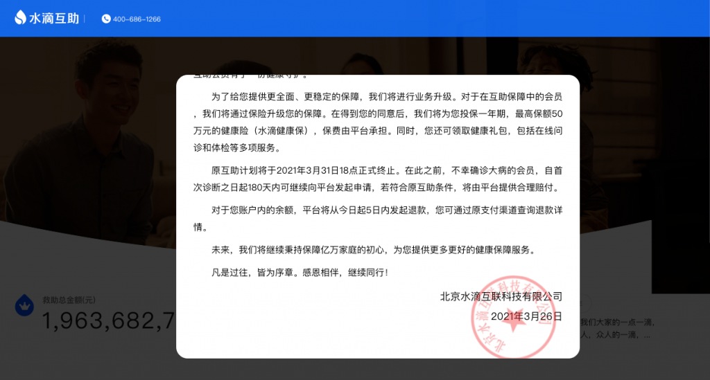 但这种医疗互助产品被监管部门定义为“非持牌经营”。今年3月31日,水滴正式终止了“水滴互助”业务。