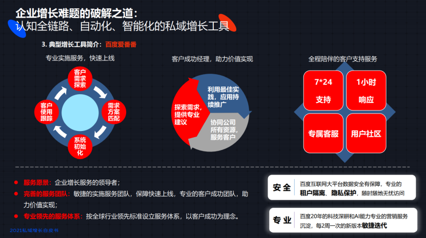 以典型增长工具百度爱番番为例来进一步说明。早期主要为商家提供线索管理的功能,目前,百度爱番番推出【爱番番拓客专业版】,聚焦为成长型企业提供智能营销云,帮助企业轻松玩转公私域整合营销。